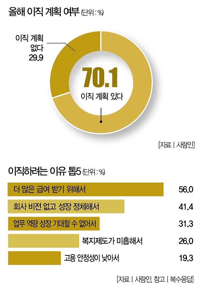 커리어 플랫폼 사람인이 직장인 1467명을 대상으로 '올해 이직 계획'을 조사한 결과, 전체의 10명 중 7명(70.1%)이 "이직 계획이 있다"고 밝혔다.