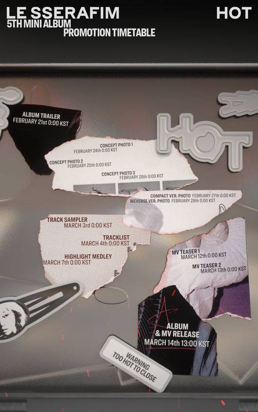 르세라핌(김채원, 사쿠라, 허윤진, 카즈하, 홍은채)은 18일 0시 쏘스뮤직 공식 SNS에 미니 5집 ‘HOT’의 프로모션 타임테이블 영상을 게재했다. 영상은 누군가가 열화상 카메라 안경으로 뜨거운 물질을 찾아다니는 장면으로 시작된다. 이어 파랗게 불타오르는 틴케이스를 발견하고, 이를 열자 타임테이블이 공개된다.