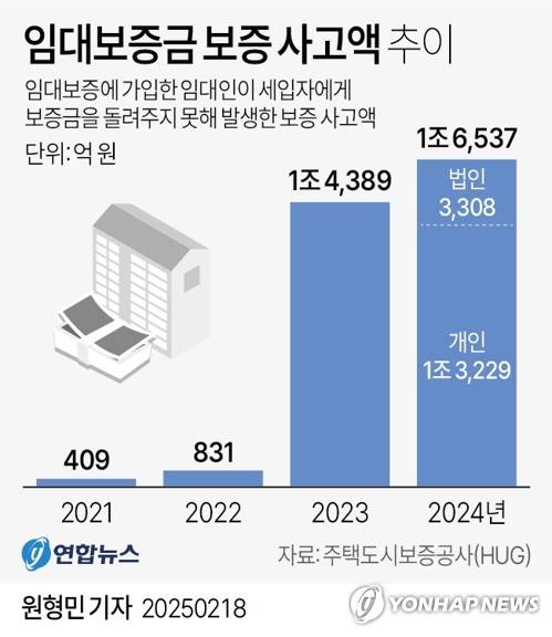 (서울=연합뉴스) 원형민 기자 = 17일 주택도시보증공사(HUG)에 따르면 지난해 임대보증금 보증 사고액은 1조6천537억원, 사고 건수는 8천105건으로 집계됐다.