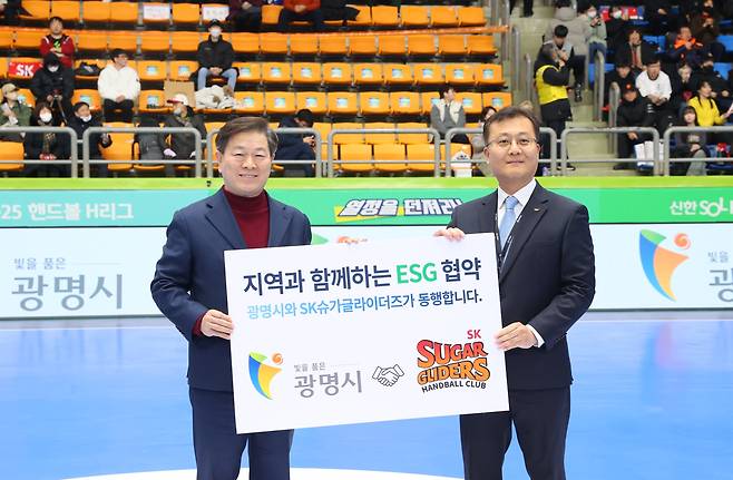 | ▲ SK슈가글라이더즈와 ESG 이행 협약’ 체결, 왼쪽부터 박승원 광명시장과 박종혁 SK슈가글라이더즈 단장. |