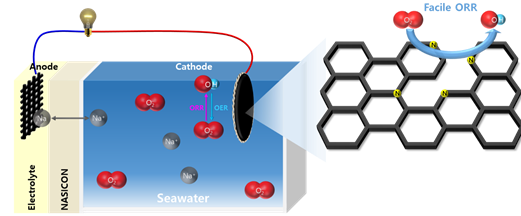해수전지는 바닷물 속 이온을 이용해 전기를 저장하고 방출하는 차세대 에너지 저장장치다. 하지만 백금 등이 사용되는 촉매 물질의 가격 부담 때문에 상용화에 어려움을 겪는다.