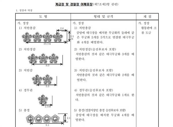 | ▲ 전체 11개 경찰 계급 중 서열 1~5위. 치안총감은 경찰청장 단 1명, 치안정감은 서울경찰청장 등 7명이 정원이다. 경찰복제에 관한 규칙 관련 별표를 갈무리한 것이다. |