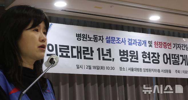 [서울=뉴시스] 김금보 기자 = 박경득 민주노총 공공운수노조 의료연대본부 본부장이 18일 오전 서울 종로구 서울대병원 암병원 지하 1층 서성환홀에서 열린 '의료대란 1년 병원 현장 어떨게 변했나, 병원노동자 설문조사 결과공개 및 현장증언 기자간담회'에서 발언하고 있다. 의료연대본부는 이날 간담회를 통해 의료공공성 강화와 공공병원 확충, 공공의사 충원 등 제도 개선을 촉구했다. 2025.02.18. kgb@newsis.com