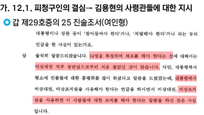 "솔직히 말씀드리겠습니다. 14명을 특정하여 체포를 해야 한다는 것에 대해서는 비상계엄 직후 장관님으로부터 처음 들었던 것이 맞습니다. 다만, 대통령께서 평소에 인물들에 대한 품평회를 많이 하셨다고 말씀을 드렸었는데, 대통령께서 비상대권, 비상조치권을 사용해야 한다는 언급을 하시면서 비상대권, 비상조치권을 사용하면 이 사람들에 대한 조치를 해야 한다는 말씀을 하신 것은 사실입니다."