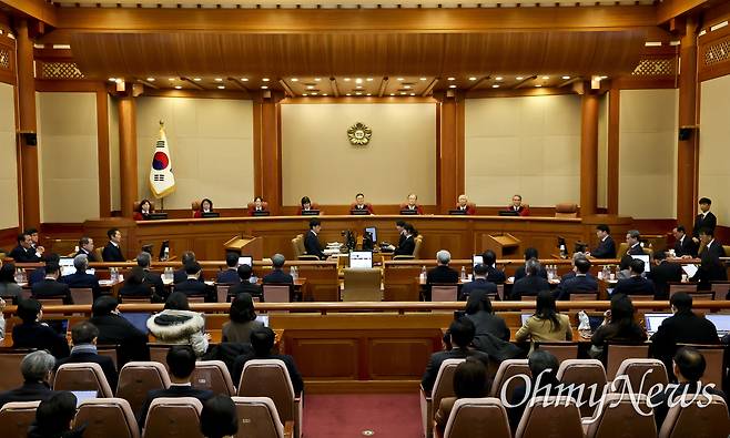 | ▲ 문형배 헌법재판소장 권한대행을 비롯한 헌법재판관들이 18일 서울 종로구 헌법재판소에서 열린 '윤석열 대통령 탄핵심판 9차 변론'에 입장해 있다. |