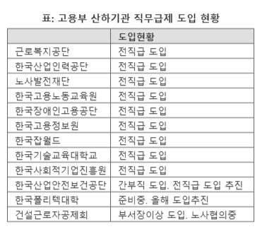 당시 고용부 산하기관 중 전직급에 직무급제를 도입한 곳은 근로복지공단, 한국산업인력공단, 노사발전재단, 한국고용노동교육원 등 4곳에 불과했다.