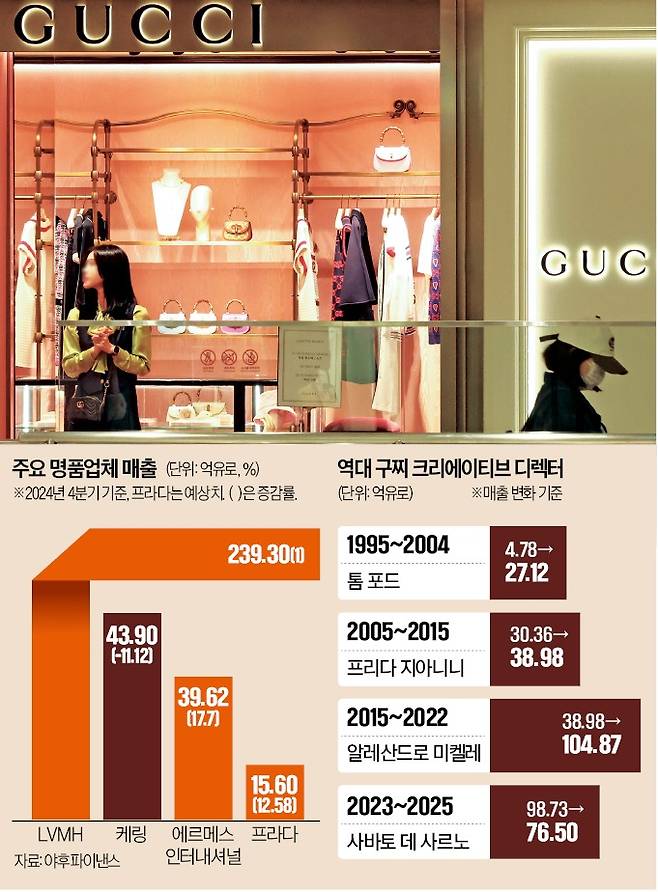 구찌가 흔들리고 있다. 중국 경기 침체에도 루이비통모에헤네시(LVMH), 에르메스 등 경쟁 브랜드의 실적이 최근 반등 조짐을 보이는 가운데 구찌는 작년 4분기에만 매출이 20% 이상 줄었다. 특유의 화려한 디자인을 버리고 ‘조용한 럭셔리’ 트렌드를 좇다가 정체성을 잃어버리고 위기에 빠졌다는 분석이 나온다.
