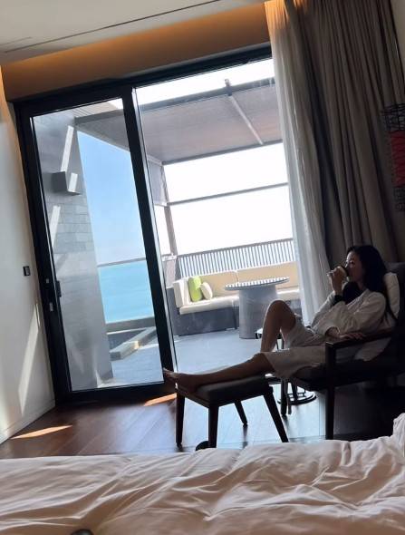 영상 속 김사랑은 바다가 보이는 분위기 좋은 레스토랑, 해변가, 호텔 등 부산 곳곳을 여행하며 여유를 즐기고 있다.