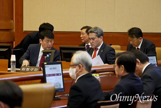 | ▲ 윤석열 대통령측 변호인들이 18일 서울 종로구 헌법재판소에서 열린 '윤석열 대통령 탄핵심판 9차 변론'에 출석해 변론 시작을 기다리고 있다. |