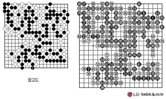 <총보> (1~228)=228수에서 끝났다. 참고도는 원성진이 돌을 거둬들인 후의 변화. 1이 최선인데 2 때 상중앙 대마가 3으로 살 수밖에 없어 백이 2점을 잡으면 반면으로도 우세하다(가운데 패는 흑이 이길 수 없다).