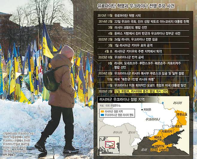 2014년 우크라이나에 불어닥친 혁명과 전쟁을 기억하는 이들에게 2022년 2월 말 러시아의 침공으로 시작된 전쟁은 예고 없이 찾아온 불행이 아니다. 2013년 11월 친러 성향의 빅토르 야누코비치 당시 대통령의 부패와 무능을 규탄하고, 유럽연합(EU) 제휴협정 체결을 촉구하며 시작된 시위는 러시아와 우크라이나가 적대적으로 돌아서는 결정적 계기가 됐다. 대통령 관저와 의회 등을 장악한 시위대는 2014년 2월 야누코비치 정권을 무너뜨렸고 러시아는 쿠데타라고 반발했다. 같은 달 러시아 특수부대로 추정되는 이들이 크림반도 주요 시설을 점령했고, 러시아는 3월 크림반도 병합을 일방적으로 선포했다. 크림반도와 마찬가지로 러시아계 주민이 많은 동부 돈바스 지역인 도네츠크와 루한스크주 친러 반군들은 유로마이단 혁명에 반발해 같은 해 4월 분리독립을 선언했다. 이를 인정하지 않는 우크라이나 정부군과 러시아 지원을 받는 반군은 8년이 넘는 긴 전쟁을 시작하게 된다. 우크라이나인들은 2014년부터 11년간 전쟁의 손아귀 속에 있다고 생각한다.