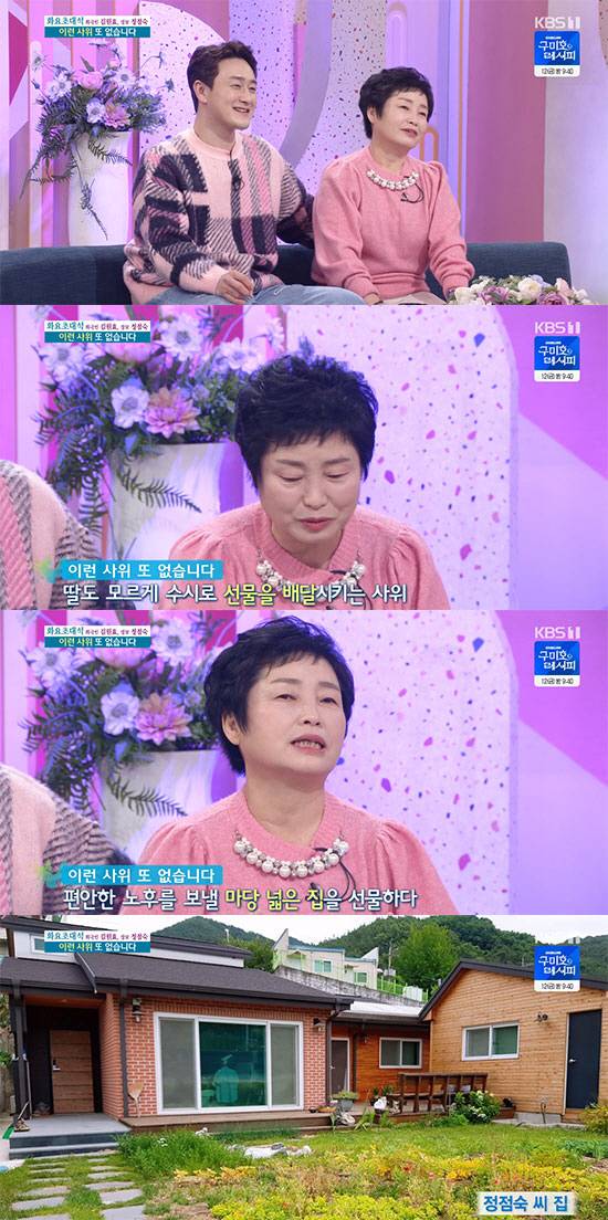 정점숙 씨는 "가슴이 멍할 만큼 눈물이 핑 돌았다. 너무 감사하고 예뻤다"라고 고마워했다. 이에 김원효는 "예전 군수님 댁이라 좋은 자재로 신경을 써서 지은 집이다. 다른 분들이 눈독 들일 때 빠르게 계약금을 넣고 사드렸다"면서 "부모님들한테 쓰는 돈은 이렇게 써야 아깝지 않다. 혼자 사시지만 누리면서 사시라고 선물했다"라며 마음을 전했다.