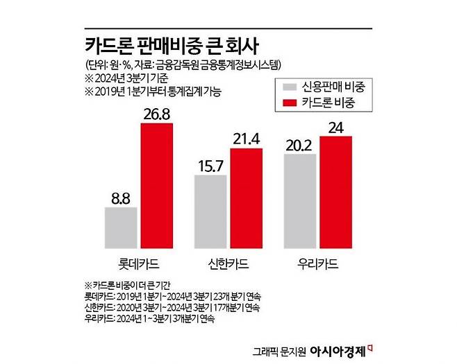 19일 금융감독원 금융통계정보시스템에 따르면 지난해 3분기 롯데카드의 전체 수익(6660억원) 대비 카드론 수익(1785억원) 비중은 26.8%다. 가맹점수수료(신판) 수익(585억원) 비중 8.8%보다 카드론 비중이 3배 크다. 신한카드 카드론 수익 비율은 21.4%로 신판 비율(15.7%)보다 5.7%포인트 높았다. 우리카드 카드론 수익 비중은 24%로 신판 비중 20.2%보다 컸다.