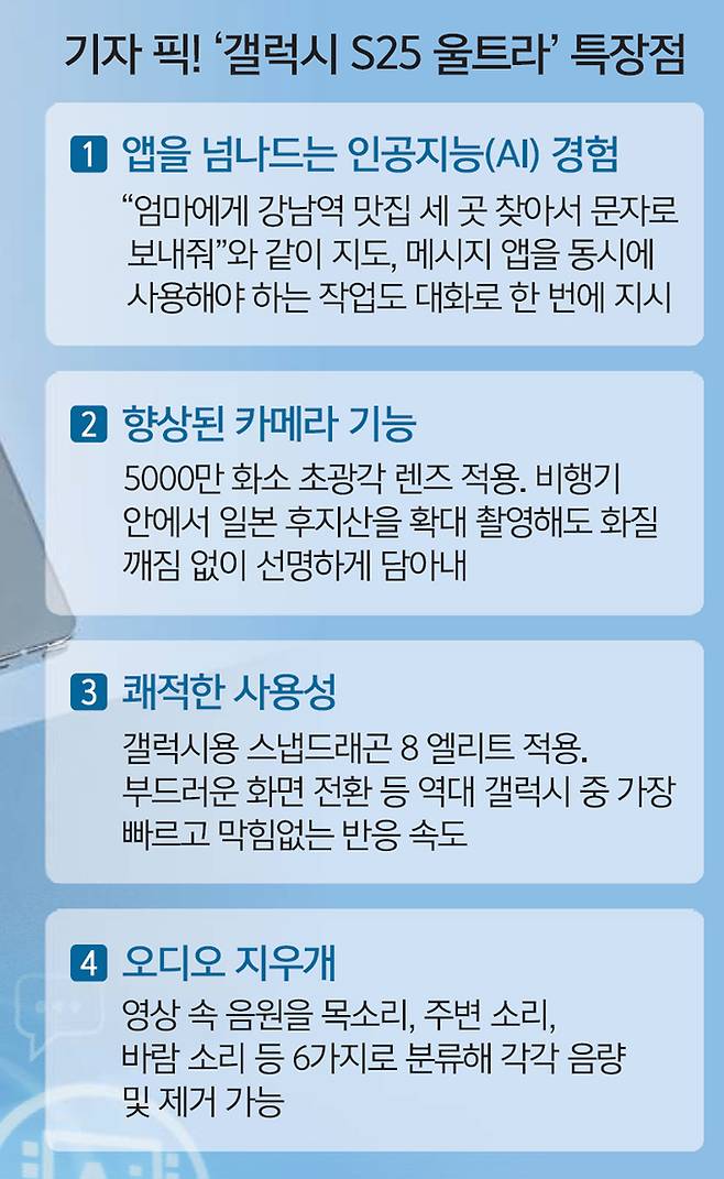 S25 시리즈부턴 제품 우측 버튼을 길게 누르기만 하면 구글의 대화형 AI ‘제미나이’를 호출할 수 있는데, 기존에 여러 앱을 켜고 수행해야 했던 작업도 말 한 마디로 지시할 수 있었다. 기존에 친구한테 강남역 맛집 3곳을 찾아 문자로 보내려면 지도 앱을 켜서 맛집을 찾고, 메시지 앱에 맛집들을 일일이 입력해 보내야 했다. 그런데 S25 울트라에선 “○○한테 강남역 맛집 3곳 찾아서 문자로 보내줘”라고 말하니 기기가 스스로 검색한 뒤 문자로 보낼 내용을 화면에 띄워줬다. “□□ 가수의 공연 일정을 찾아서 캘린더에 추가해줘”라고 말하니 구글 검색부터 캘린더 일정 작성까지 한 번에 해결됐다.
