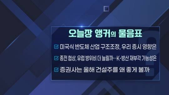 -정부 주도로 진행될 미국 반도체 산업 구조조정이 우리 증시에 미칠 영향은 어떤지 -유럽의 불만을 만들어낼 수 밖에 없는 현재의 러-우 전쟁 종전 협상이, 오히려 한국 방산주에 모멘텀을 만들어낼 요인이 될지 -건설주 회복세는 얼마나 더 갈 수 있을지