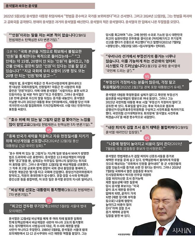 “호수 위에 떠 있는 달 그림자 같은 걸 쫓아가는 느낌을 많이 받았고요(2월4일 헌법재판소 탄핵심판 5차 변론기일).” vs “종북 반국가 세력을 척결하고 자유 헌정질서를 지키기 위해 비상계엄을 선포합니다(2024년 12월3일 용산 대통령실 긴급 대국민 담화).”