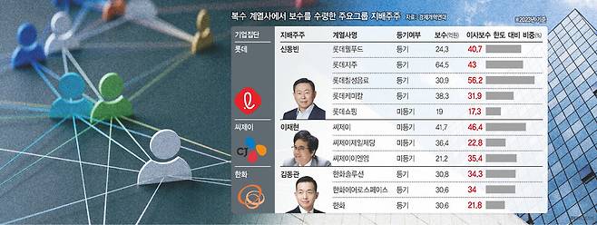 2023년 기준, 복수의 계열사에서 가장 많은 보수를 받은 재벌 총수는 신동빈 롯데그룹 회장이다. 신 회장은 5개 계열사에서 총 177억원의 보수를 수령했으며, 비상장 계열사에서도 보수를 받았을 경우 실제 보수 총액은 이보다 더 증가할 것이다. 한화그룹에서도 김동관 부회장과 김승연 회장이 복수의 계열사에서 고액 보수를 받은 것으로 나타났다. 김동관 부회장은 한화 등 대표이사로 재직 중인 3개 계열사에서 총 92억원의 보수를 받았으며, 김승연 회장은 한화와 한화솔루션에서 미등기 임원으로 재직하며 72억원을 수령했다.
