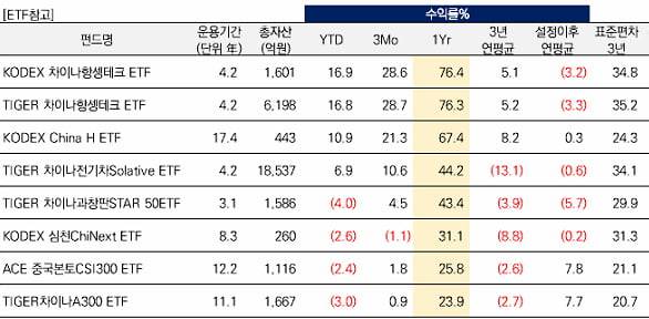 다음은 '과창판STAR50' ETF다. 중국 혁신기업 양성을 위한 상하이 과학창업판 시장에서 선정된 대표종목 50개로 구성된 상품이다. 중국 정부의 6대 전략 신흥산업으로 구성돼 있다. 반도체, 인공지능, IT보안, 항공우주, 로봇, 전기차 등이다. '과창판STAR50지수'는 최근 1년 37% 상승했고, 항셍테크지수는 76%올랐다.
