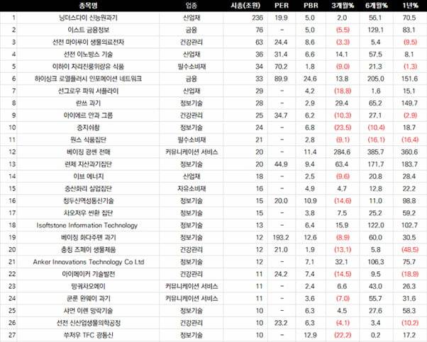 위는 과창판 STAR50지수(흰색)와 항셍테크지수(주황)의 2020년 7월 이후 누적 성과 추이를 추적한 것이다. 최근 급등에도 불구, 둘다 -20~30%대에 위치하고 있다. 과창판50 종목이 혁신기업이라고 해서, 국내 코스닥지수와 비슷하다고 생각할 수 있지만 실제 해당 종목들의 시가총액은 작지 않은 수준이다. 해당 지수의 상위 30종목의 평균 시가총액은 약 18조원이다. 시총 18조원이면 한국 유가증권시장 상위 20위급 이상으로, 결코 작은 규모가 아니다.