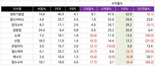 역시 성장 중심의 홍콩상장지수인 항셍테크놀로지지수가 1년성과가 가장 높다. 65%다. 그리고 역시 홍콩의 HSCEI, 그리고 과창판스타50지수, 심천의 차이넥스트 순으로 추려볼 수 있다. 아쉽게도 업종 분산이 잘되어있는 CSI300이나 상해A지수는 상승폭이 더딘 것을 확인할 수 있다.