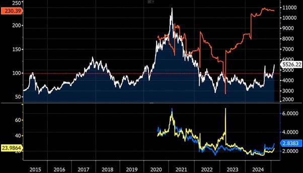 아래는 항셍테크지수의 흐름을 긴 기간동안 추적한 것이다. 국내 시장엔 2020년 말 상장되었지만, 지수 정보는 2015년초부터 추적해 볼 수 있다. 흰색이 항셍테크지수이고, 주황색은 포워드EPS(주당순이익), 그리고 하단에 있는 노란색이 PER, 파랑은 주가순자산비율(PBR)이다.