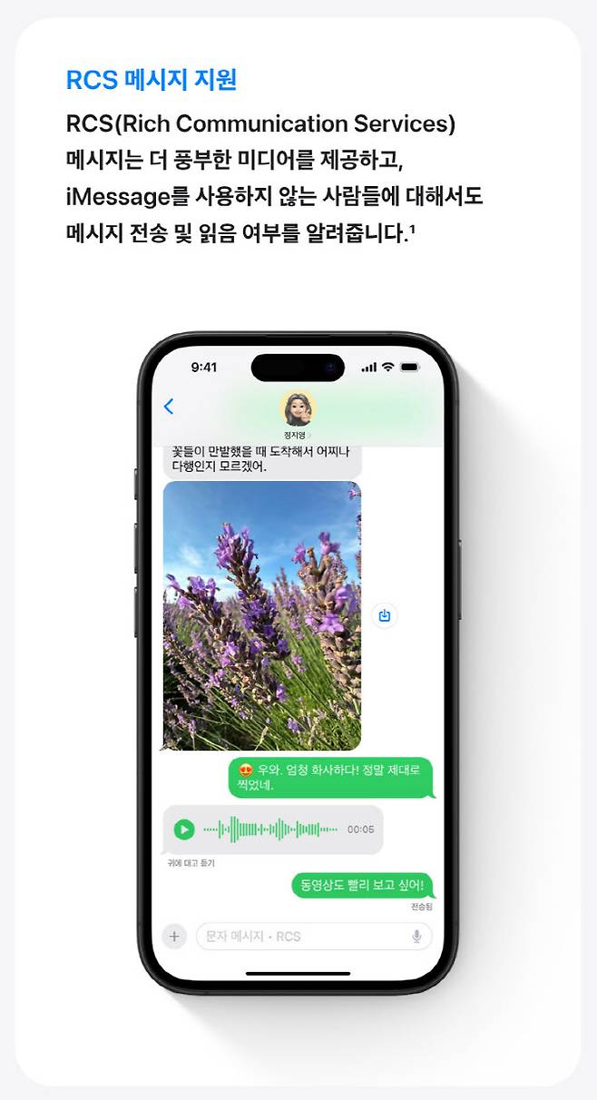올해 하반기부터 애플 아이폰과 삼성전자의 갤럭시 스마트폰 간 차세대 문자 전송 서비스(RCS)를 이용한 대용량 파일 전송 및 메시지 전송이 가능해진다.
