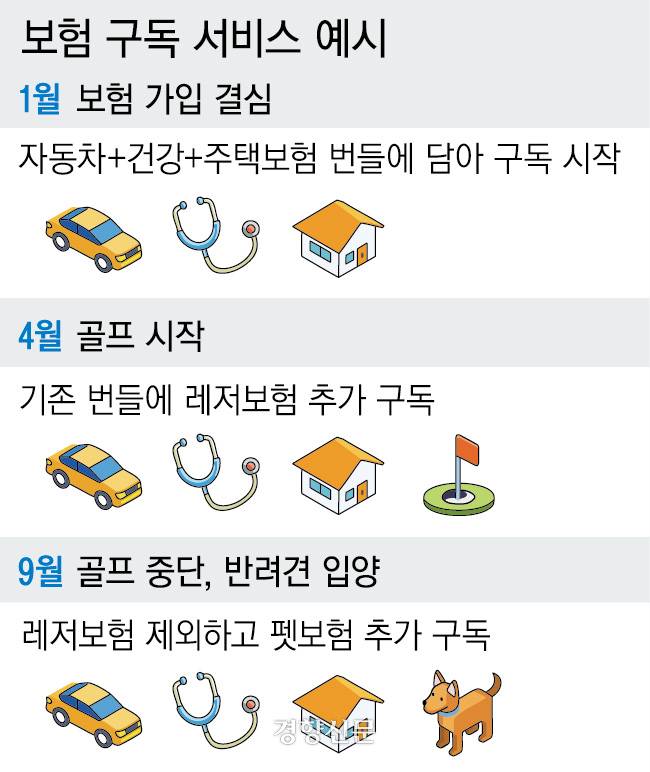 예컨대 처음 보험 구독 서비스에 가입할 때에는 자동차·건강·주택보험만 번들에 담아 구독을 시작할 수 있다. 몇 달 뒤, 골프 등 취미가 새롭게 생긴다면 구독하던 번들에 레저보험을 추가할 수 있다. 이후 골프를 그만두고 반려견을 입양하게 되면 레저보험을 제외하고 펫보험을 추가해 구독을 이어갈 수 있다.