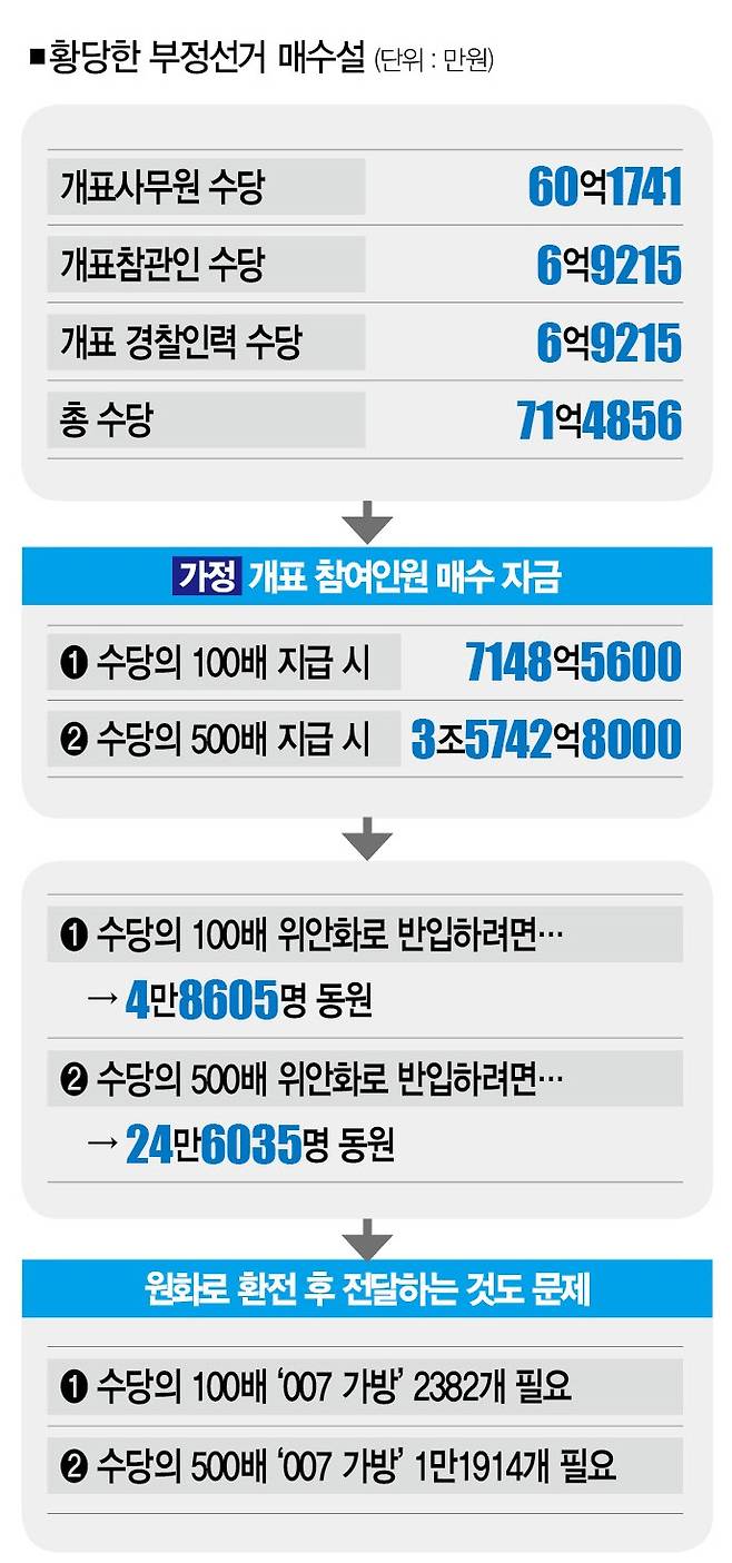 개표소 한곳이 받는 수당의 100배인 28억4800만원을 51곳의 개표소에 뿌리려면 1452억4800만원이 필요하다. 매수 금액으로 수당의 500배를 주려면 7262억4000만원을 뒷주머니에 꽂아줘야 한다.