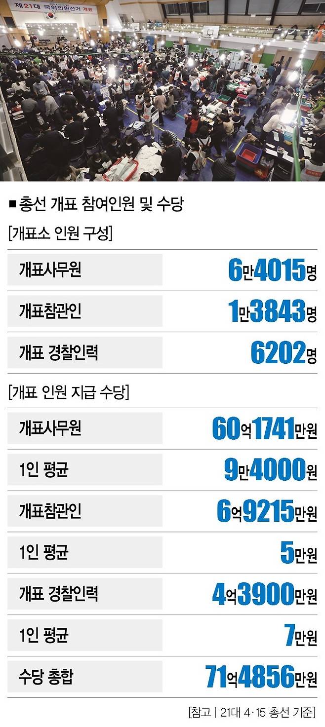 이를 토대로 계산하면 개표사무원 60억1741만원(6만4015명×9만4000원), 개표참관인 6억9215만원(1만3843명×5만원), 경찰 4억3900만원(6202명×7만원) 등 총 71억4856만원의 나랏돈을 지급했다.
