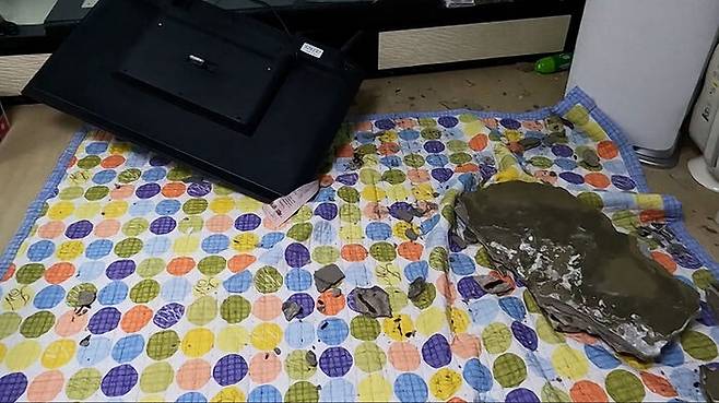 급히 나와 보니 거실 천장은 뻥 뚫렸고 바닥 이불 위엔 육중한 콘크리트 덩어리가 떨어져 있었습니다.