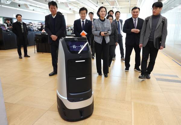 국회 과학기술정보방송통신위원회 의원들이 19일 경기도 성남시 네이버 본사를 방문해 네이버랩스가 개발한 배달 로봇 '루키'를 살펴보고 있다. 이날 의원들은 최수연 네이버 대표를 만나 인공지능(AI) 기술 개발 현황을 들었다. 연합뉴스