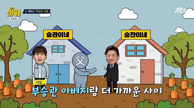 이날 부 의원은 "희귀 성씨다. 부승관과는 먼 친척이냐"는 MC 김구라 질문에 "멀지도 않다. 바로 옆집 아이다. 제주 구좌읍 하도리에 살았다"며 "실질적으로 (부승관보다는) 승관이 아버지와 같이 놀았다"고 말했다.