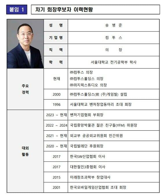 송병준 의장은 현재 벤처기업협회 부회장으로, 지난 13일 전임 회장단으로 구성된 벤처기업협회 회장추천위원회의 만장일치 추천을 거쳐 이번 정기 이사회에서 공식적으로 제12대 회장 단독 후보에 올랐다.