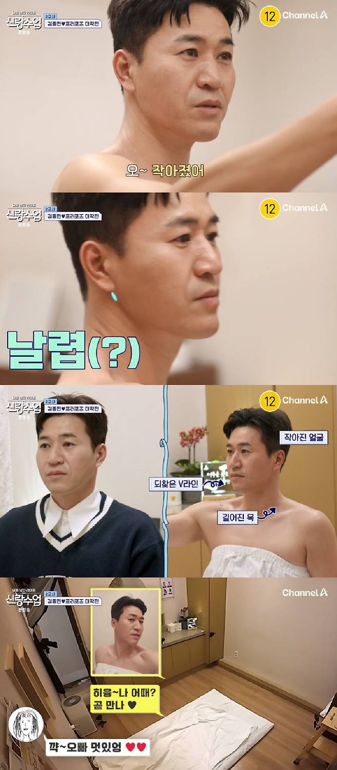 관리 후 김종민은 붓기로 빠지며 작아진 얼굴과 날렵한 턱선을 자랑했고, 심진화는 "샤프해졌다"며 감탄했다. 김종민은 자신의 모습을 사진으로 찍은 뒤 예비 신부에게 문자를 보냈고, 예비 신부는 "오빠 너무 멋있다"고 하트 이모지까지 덧붙이며 애정 가득한 반응을 보였다.