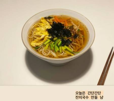 거실 식탁엔 직접 만든 골뱅이 소면과 닭꼬치, 황도, 삶은 김치만두, 캔맥주 두 개가 놓였다.