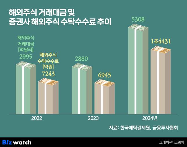국내증권사 28곳(해외주식 수탁 수수료 집계되는 곳 기준)이 2024년 한해동안 해외주식 거래중개로 벌어들인 수수료 수익은 1조4430억원으로 집계됐다. 1년 전보다 107% 급증한 규모다.
