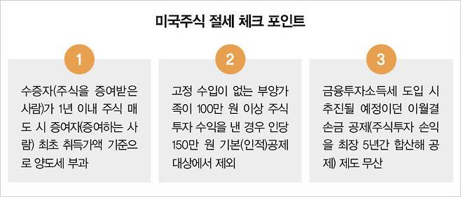 국내 주식과 미국주식 투자의 차이점 중 하나는 '양도소득세 부과 여부'다. 대주주 등을 제외하고는 주식 양도소득이 발생해도 별도의 세금을 내지 않는 국내 주식과 달리, 미국주식에는 고율 양도세(22%)가 부과된다. 그간 이 세금을 피해 가는 가장 좋은 방법은 배우자 등 가족 증여였다. 증여 시 주식 취득가액이 증여 시점 전후 2개월(총 4개월) 평균으로 계산돼 양도세가 대폭 줄고, 배우자는 10년간 6억 원, 성인 자녀는 5000만 원 한도로 증여세가 면제되는 점을 이용한 것이다.