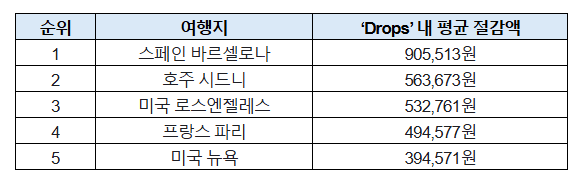 또 가격이 가장 많이 하락한 여행지는 스페인 바르셀로나였다. 1월 한 달간 'DROPS'를 통해 한국인 여행객들은 평균 18만원을 절감했으며, 스페인 바르셀로나가 가장 높은 평균 절감액을 기록했다.