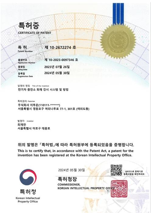이투온은 지난해 전기차 충전소 화재 감시 시스템 및 방법에 대한 특허(등록번호 10-2672274)를 취득했다.