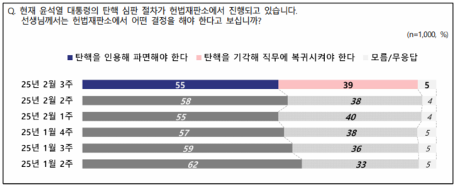 지난주 조사와 비교해 ‘탄핵 인용’ 응답은 3%포인트 줄었고, ‘기각’은 1%포인트 늘었다.