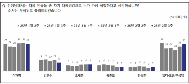 차기 대통령 적합도 조사에선 이재명 민주당 대표 31%, 김문수 고용노동부 장관 10%, 오세훈 서울시장 8%, 홍준표 대구시장 5%, 한동훈 전 국민의힘 대표 5% 순이었다. 지난주와 비교해 이 대표는 1%포인트 떨어졌고, 김 장관은 3%포인트 하락했다.