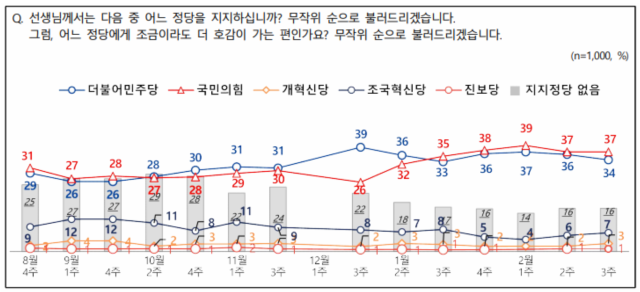 정당 지지도 조사에서 국민의힘과 더불어민주당이 각각 37%, 34%를 기록했다.