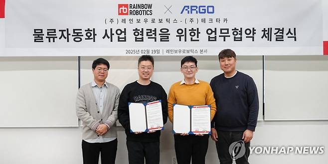 (서울=연합뉴스) 지난 19일 대전 유성구 레인보우로보틱스 본사에서 열린 물류자동화 사업 협력을 위한 업무협약을 체결한 후 관계자들이 기념 촬영하고 있다.