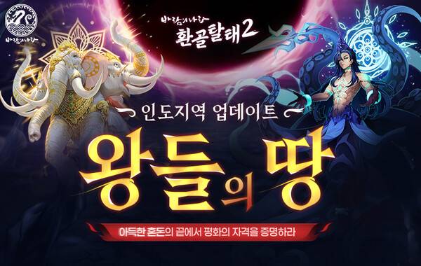 '환골탈태2' 3차 업데이트로 선보이는 '왕들의 땅'은 8차 승급 이후 즐길 수 있는 신규 최상위 사냥터로, 실제 인도 신화에 존재하는 지역을 새롭게 해석해 구현했다.