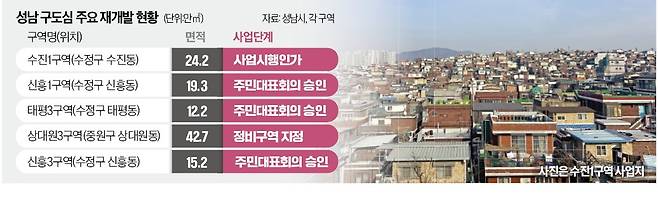 지난 19일 찾은 경기 성남 수정구 수진동, 신흥동 인근은 노후 단독과 연립주택이 닥지닥지 붙어 있었다. 재개발을 알리는 현수막도 곳곳에 눈에 띄었다. 성남 원도심인 수정구와 중원구 일대에서 대규모 정비사업이 활발하게 이뤄지고 있다. 성남시는 원도심 개발에 속도를 내 분당·판교신도시와 벌어진 주거 환경 격차를 좁힐 계획이다. 원도심 정비사업이 탄력을 받으면서 성남이 수도권 남부 핵심 주거지 위상을 다질 것이라는 기대가 나온다.