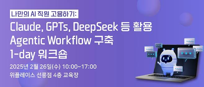 전자신문인터넷과 케이모바일이 공동 주관하는 “나만의 AI 직원 고용하기: Claude, GPTs, DeepSeek 등 활용 Agentic Workflow 구축 1-day 워크숍”이 2월 26일(수) 위플레이스 선릉점에서 개최된다.