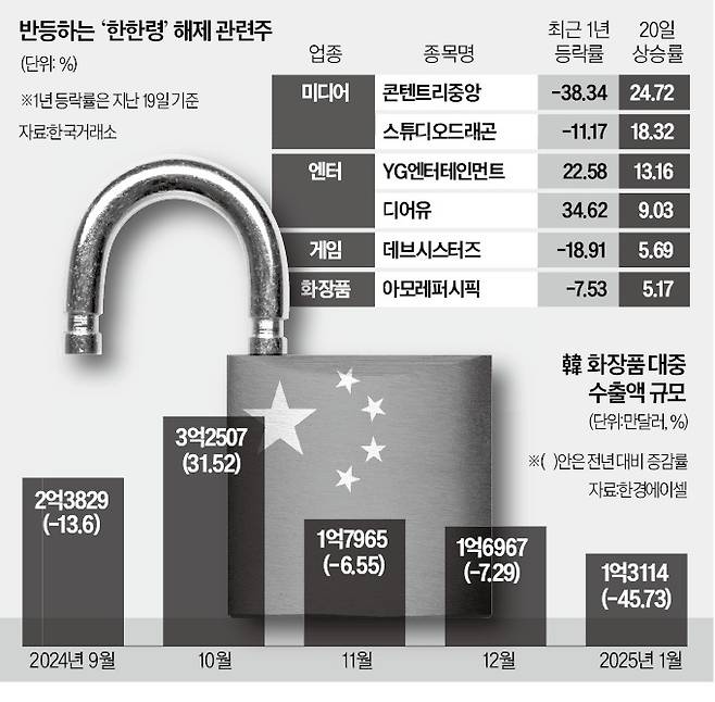 중국이 이르면 오는 5월부터 한한령(한류 콘텐츠 금지령)을 해제할 것으로 알려지자 관련주가 일제히 반등했다. 2017년 사드(고고도 미사일방어체계) 배치의 보복으로 시작된 한한령은 오랜 기간 미디어와 엔터테인먼트, 화장품 기업의 발목을 잡았다. 전문가들은 실적 개선주를 중심으로 당분간 수급이 몰릴 가능성이 높다고 내다봤다.