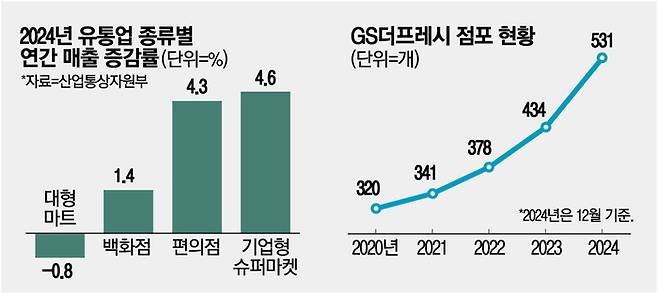 20일 GS리테일에 따르면 GS더프레시의 지난해 점포 수가 500개(531개)를 돌파했다. 2020년 320개에서 2023년 434개로 늘더니 지난해는 100점 가까이 늘어 531개를 넘었다. 2020년만 하더라도 가맹점과 직영점은 반반 비중이었는데, 지난해에는 가맹점이 78%(419점)에 달할 정도로 가맹 비율이 커졌다.