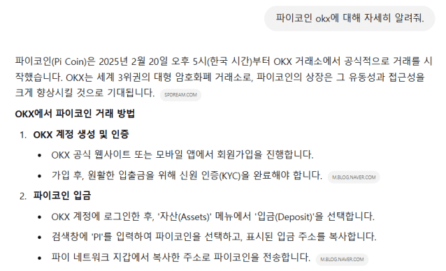 챗 GPT 답변: 파이코인(Pi Coin)은 2025년 2월 20일 오후 5시(한국 시간)부터 OKX 거래소에서 공식적으로 거래를 시작했습니다.