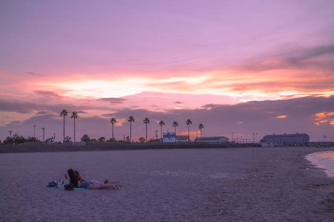 동양의 캘리포니아 해변이라는 수식어가 붙어도 어색하지 않다. 하늘로 곧게 뻗은 야자수와 해질녘 붉은 풍경, 모래사장에 누워 피크닉을 즐기고 바람과 보드를 타는 이들이 어우러져 영화의 한 장면처럼 보인다.